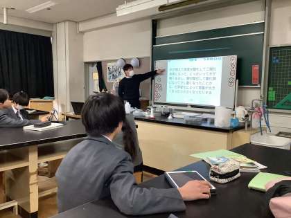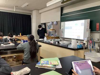 化学変化と質量の関係について学んでいます。化学変化と質量の関係についての自分の仮説を立て、ロイロノートでまとめて全体で共有しています。学び合い、考えを深めています。