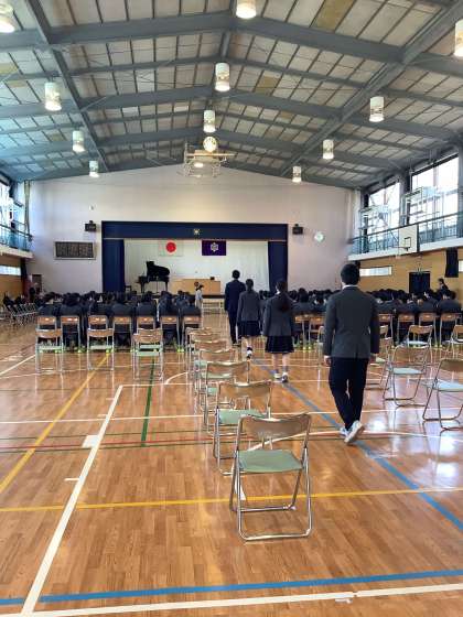 卒業式の予行練習を行っています。卒業生の入場から退場まで練習しました。卒業生も在校生もみんなしっかりした態度で練習に臨んでいます。