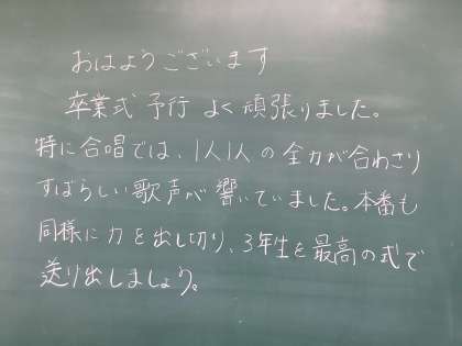 気持ちのいい天気の朝です。3年生の卒業式までの登校日数も残りわずかです。1、2年生の登校日もあと4日です。楽しい一日になりますように!