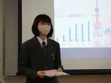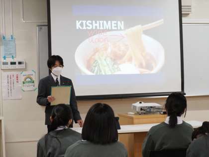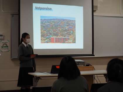 2年生最後の英語スピーチ発表会の様子です。自分のおすすめの観光地について調べ、その魅力を発表しました。日本や海外の行ってみたいところや行って良かったところなどについて、流暢な英語で説明していました。
