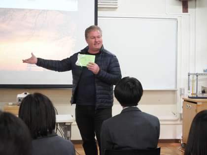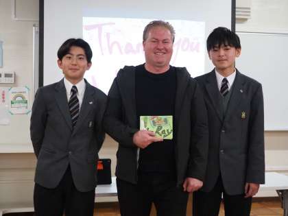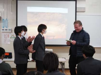 2年生も2年間、ALTのレイ先生にお世話になりました。代表生徒からの言葉と寄せ書きをプレゼントしました。喜んでもらえて、みんな笑顔になりました。