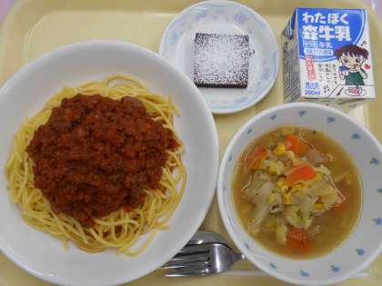 主食の「スパゲッティミートソース」はソースをじっくり煮詰めることの他に、最初のみじん玉ねぎを甘くあめ色になるまでしっかり炒めるところからこだわって作りました。