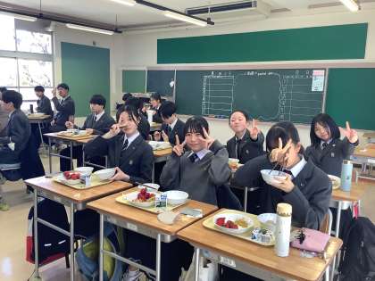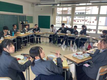 クラスメイトと楽しい話をしながら、中学校最後の給食を味わっています。