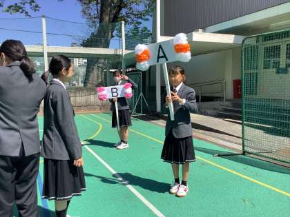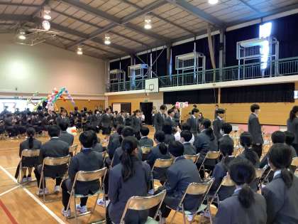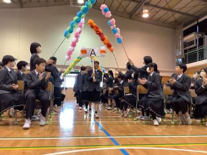 新入生が花のアーチをくぐって体育館に入場してきました。