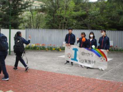 生徒会役員が元気なあいさつで生徒を迎えています。