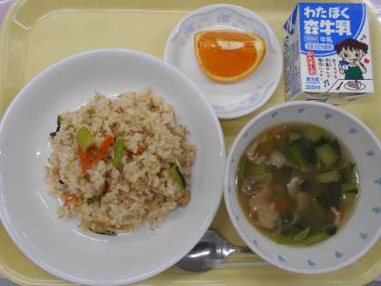 今日の主食は「じゃこべえピラフ」でした。「じゃこべえピラフ」のじゃこはちりめんじゃこ、べえはベーコンのことをさしています。