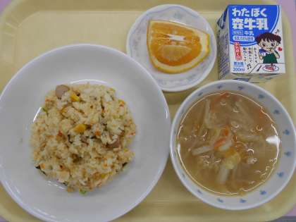 今日の主食は「大豆ピラフ」でした。給食では豆がよく使われますが、その理由は体をつくる「たんぱく質」が豊富で、そのほかにもビタミンやカルシウム、鉄分などの不足しがちな栄養素を多く含むからです。