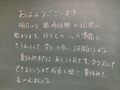 6月19日(水)から3日間、2年生の職場体験学習が実施されます。期待や不安、緊張があると思いますが、それぞれの場所で何事にも前向きな姿勢で一生懸命取り組み、たくさんのことを学んできてほしいと思います。今年度は、地域の32の事業所の方々にご協力いただき、貴重な体験ができます。感謝の気持ちをもって取り組み、充実した3日間にしてください。