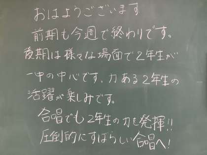 前期学年委員が4月からのクラスの成長と課題を学年のみんなに話しました。堂々と話をする姿、前を向いてしっかり話を聞く姿に中学2年生としての成長を再確認することができました。