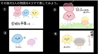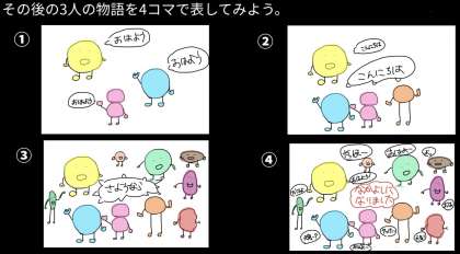 最後に、物語の続きを描きました。あいさつがつくる明るい世界が描かれていました。
