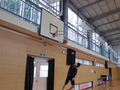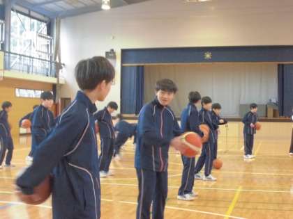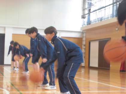 男子体育でバスケットボールを行いました。レイアップシュートやドリブルに夢中になっています。