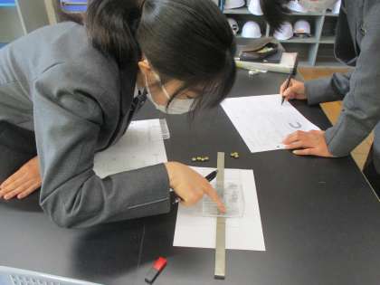 物理の授業です。磁石の周りの磁界の様子を調べました。