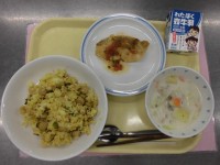 今日の献立は『五目炒飯 ワンタンスープ 中華風蒸しカステラ 牛乳』でした。中華風...