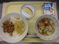 今日の献立は『油麩と卵のそぼろ丼 ひっつみ汁 りんご 牛乳』でした。