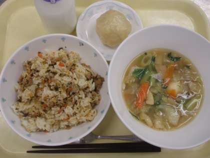 今日の給食は、高菜ごはん・タイピーエン・いきなり団子・牛乳です。