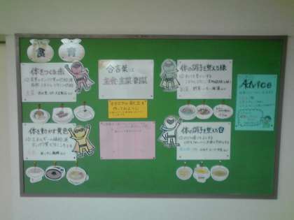 保健室前の掲示板に「食育コーナー」があります。今回は「合言葉は『主食』『主菜』『副菜』」です。