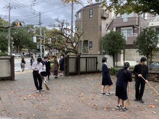 11月9日(火)から19日(金)(定期考査期間を除く)まで挨拶運動を行っています。また、分担して落ち葉掃きも行っています。