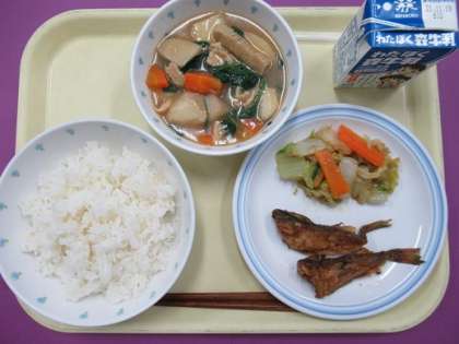 今日の献立は、ご飯、ハタハタの甘露煮、ごま和え、治部煮、牛乳でした。