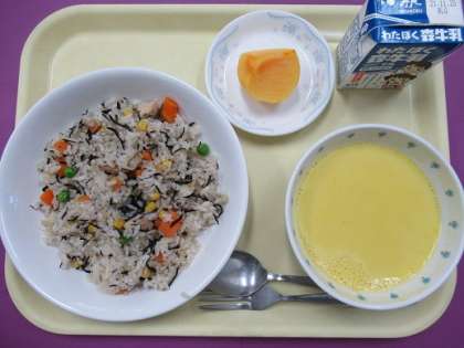 今日の給食は、ひじきピラフ、かぼちゃのポタージュ、柿、牛乳でした。