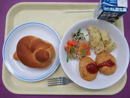 今日の献立は、ミルクパン、豆腐のナゲット、ごまポテト、切干大根のベーコンソテー、牛乳でした。