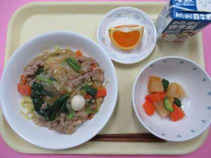今日の献立は、豚肉と青菜のあんかけそば、カクテキ、清見オレンジ、牛乳でした。