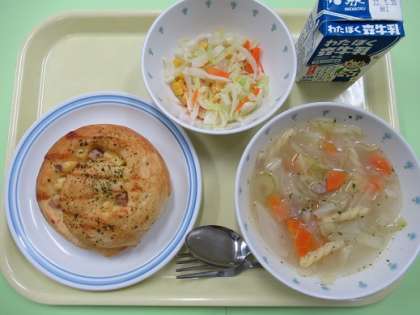 今日の献立は、手作りハムロールパン、パスタ入り野菜スープ、コールスローサラダ、牛乳でした。