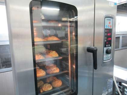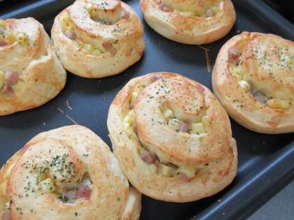 手作りハムロールパンは、給食室で生地から作りました。角切りのハムやチーズを伸ばした生地でくるくると巻き、輪切りにしたものをオーブンで焼いています。
