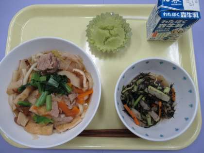 今日の献立は、五目うどん、大根とひじきのサラダ、米粉のモチモチ蒸しパン、牛乳でした。
