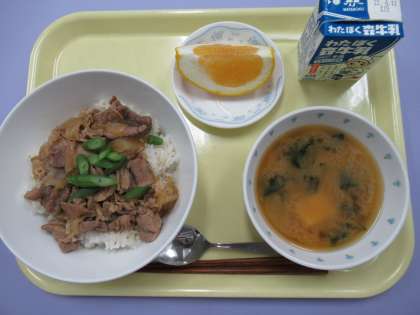 今日の献立は、豚丼、みそ汁、美生柑、牛乳でした。