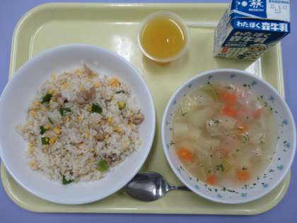 6月4〜10日は「歯と口の健康週間」です。カルシウムは歯や骨をつくるのに重要で、牛乳や乳製品・小魚・野菜・大豆製品などに多く含まれています。今日は、小魚(ちりめんじゃこ)をたっぷり加えたピラフにしました。