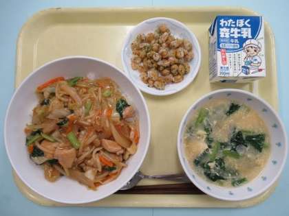 今日の献立は、ケイチャン丼、かき玉汁、のり塩大豆、牛乳でした。