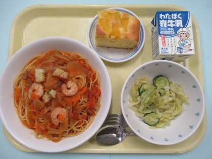 今日の献立は、スパゲッティ海の幸ソース、グリーンサラダ、パイナップルケーキ、牛乳でした。