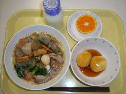けんちんうどん みたらし団子 塩みかん 牛乳