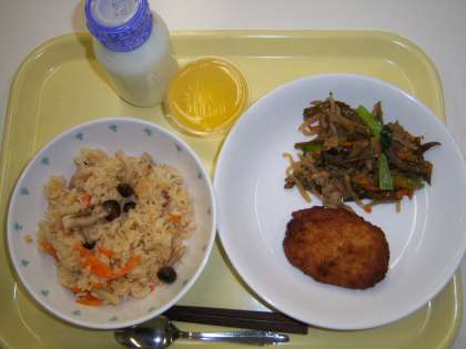 しめじご飯 ゼリーフライ 茎わかめの金平 アップルゼリー 牛乳