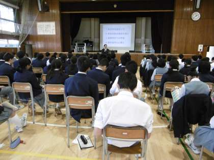 14日(水)に3学年で「高校の先生の話を聞く会」を開催しました。