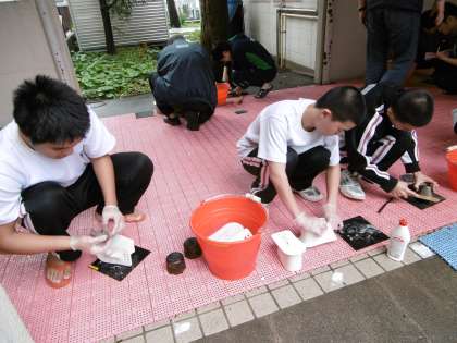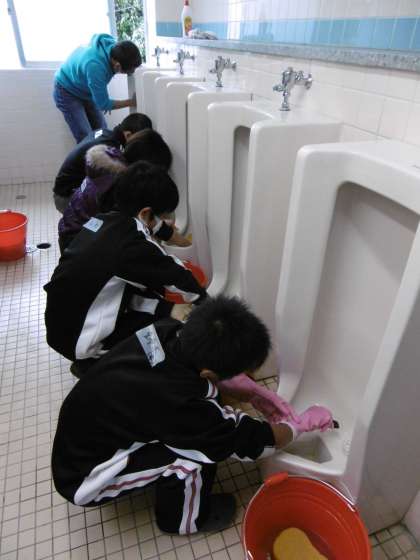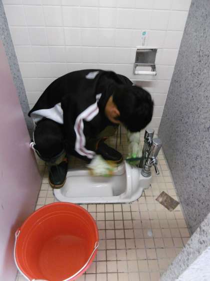 各班リーダー、サブ・リーダーの指導の下、真剣に便器を磨いています。