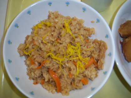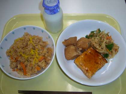 菊花入り子ぎつねご飯 千草焼き 大根とじゃこのサラダ じゃが芋のおかか煮 牛乳
