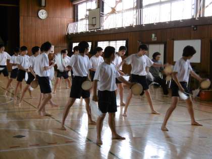 3年生は保健体育の授業でした。男子は体育館で「エイサー」を練習していました。