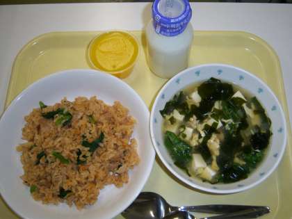 中華風五目炊き込みご飯 豆腐と卵のスープ オレンジゼリー 牛乳