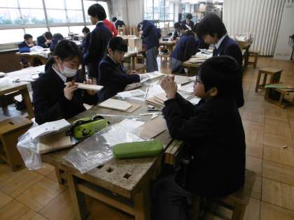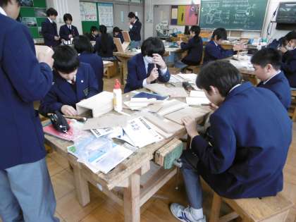各自の設計図に基づいて、本立てや小物入れを組み立てています。