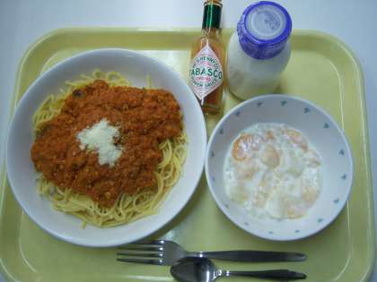 スパゲティミートソース タピオカ入りヨーグルト 牛乳