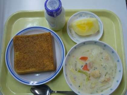 アーモンドトースト 白菜と肉ボールのクリームスープ りんご 牛乳