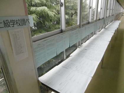 2学年の廊下に、夏休みの課題「上級学校調べ」を展示しました。