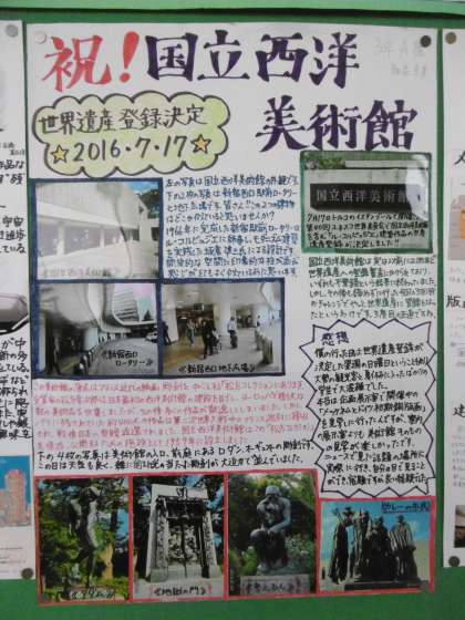 美術科夏休みの宿題「美術館見学新聞」が美術室前に掲示されています。