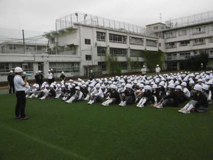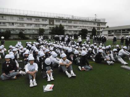 担任の指示により、ヘルメットを着用し廊下に整列、校庭に避難しました。
