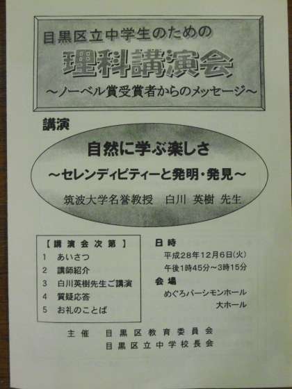 講師の先生はノーベル化学賞を受賞された白川英樹先生で、演題は「自然に学ぶ楽しさ〜セレンディピティーと発明・発見」でした。