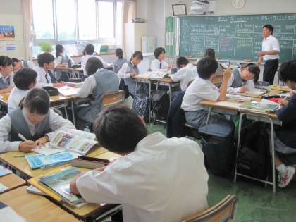 社会科の授業では班毎に課題に取り組んでいました。