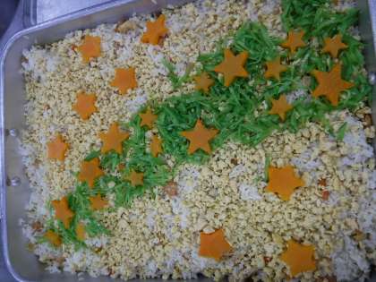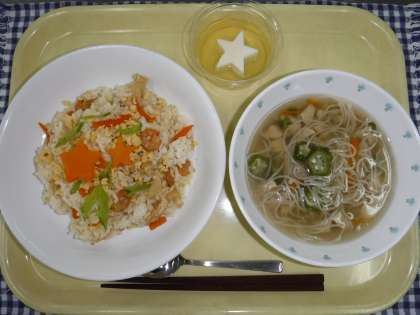 デザートの七夕ゼリーは、りんご味のゼリーの真ん中に、星形のミルク寒天を浮かべて作りました。七夕だけのスペシャルデザートです。
