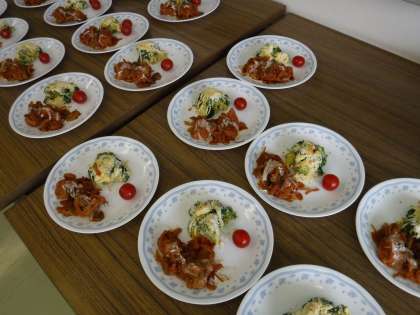 卒業前の楽しい思い出のひとつとなるよう、給食室のみなさんが、心を込めてお料理を作ってくださいました。特に、デザートのチーズケーキが大好評でした!