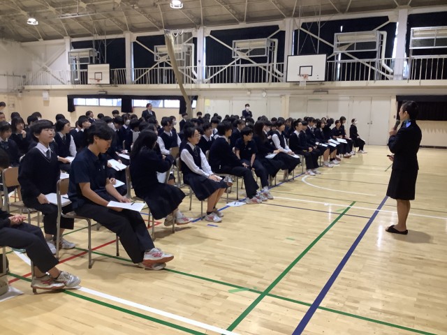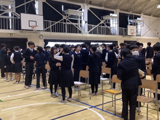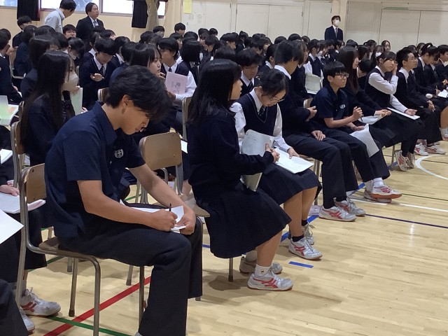 今日は1時間目が始まる前に1年生の学年集会があり、各クラスの学級委員から「こんなクラスにしていこう!」という熱い思いが伝えられました。